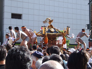 Anyway I'm back in Tokyo now. The first weekend back was Sanja Matsuri, which is a big festival in Asakusa. Me and Henry went and took lots of photos. There were thousands of people watching the festival. What happens is groups of people carry a temporary shrine called a mikoshi around the town, chanting, singing and blowing whistles. The are many different groups from all over Japan. I'm not exactly sure what this Matsuri is about, I know that Matsuri's that happen in September are to do with the rice harvest. It was Henry's first Matsuri, so he really enjoyed it. Some people stand on the mikoshi, but that was banned for the 1st time ever this year, but yakuza looking men did it and were promptly arrested.